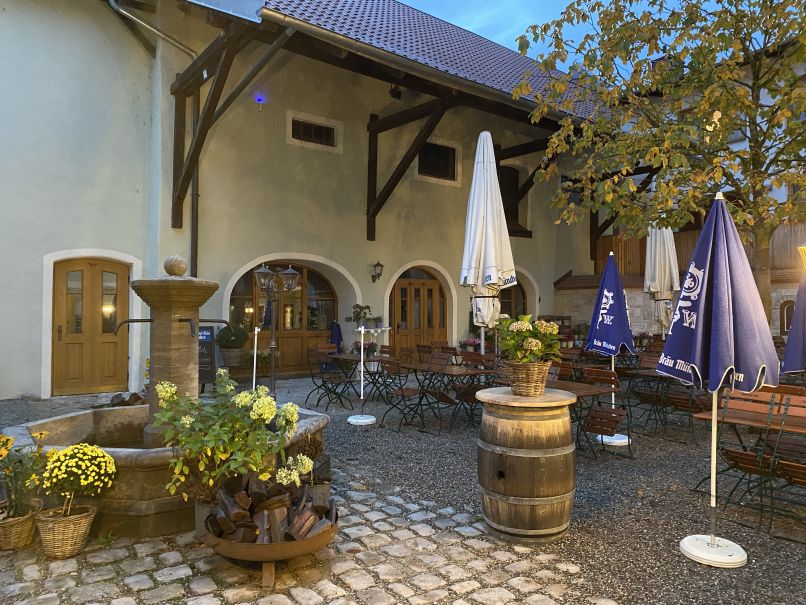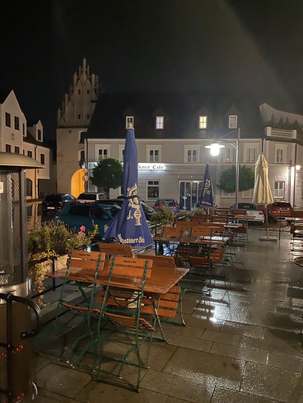 Noch mal kurz vor die Tür - nun regnet es doch ein bisschen, aber unser Hotelzimmer ist ja über dem Wirtshaus…wir haben‘s gut!