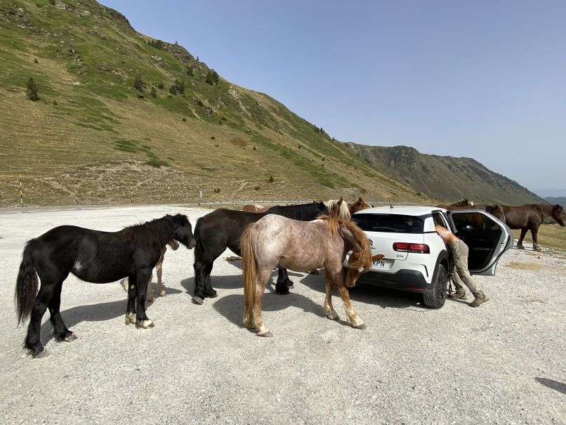 Die Wildpferde auf dem Pass waren auch der Hit und wenn Thomas nicht die Pferde von dem Auto weg gelotst hätte, hätte die Besitzerin wohl samt ihrem Hund auf dem Berg übernachtet…😉