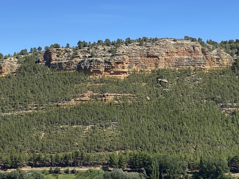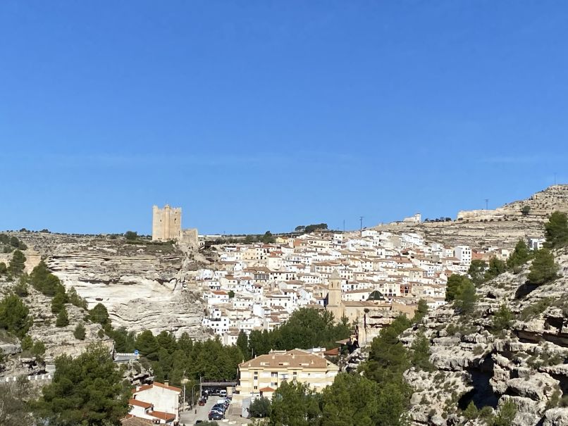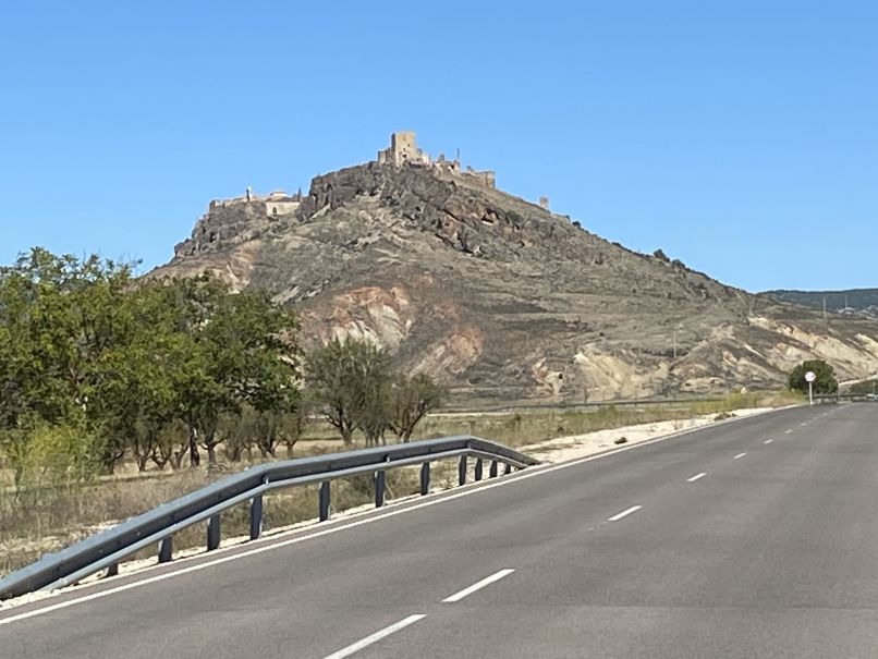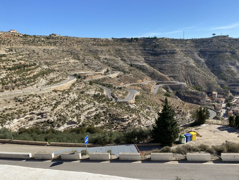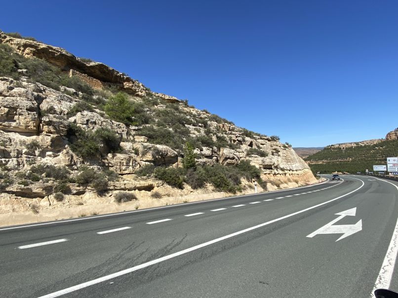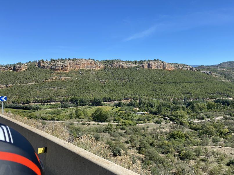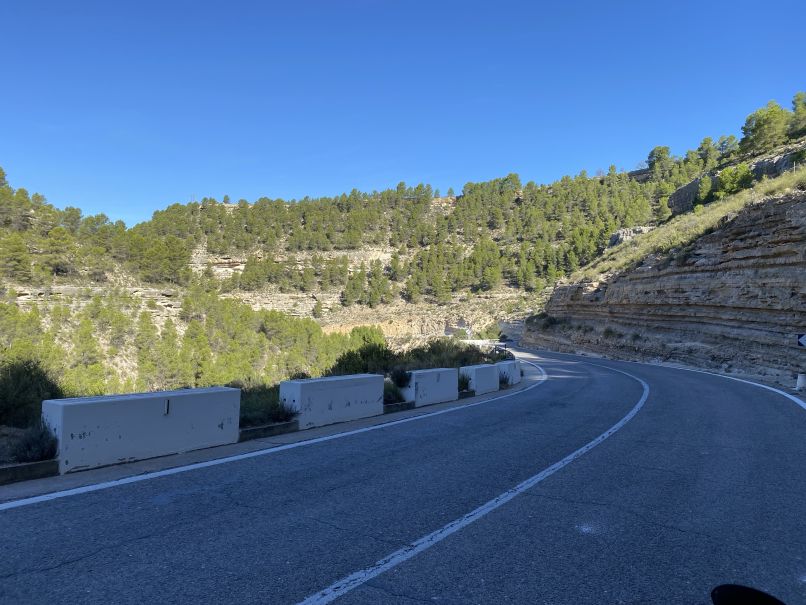 Der Weg dorthin führte über eine abwechslungsreiche Landschaft. Schnurgerade Straßen, Kurven in einer Schlucht beim Dörfchen Alcalá del Júcar, weit geschwungene und auch mal sehr kurvenreiche Straßen durch Weinanbaugebiete, Obstbäume und Felder. Die Landschaft wechselte von Hochebene und Mittelgebirgen, Kalkstein, rotem (vermutlich) Lehm und Sandsteinen in unterschiedlicher Ausprägung. Aber man kann ja auch nicht an jeder Ecke stehen bleiben und Fotos machen… Ab und zu ein Dorf oder Städtchen am Hang, einer maurischen Festung auf einem Berg und dann wieder Pinienwälder. Teilweise ist die Landschaft sehr karg, ein paar Kilometer weiter üppig grün. Teruel selbst liegt wieder in einer Hochebene über 900 m Seehöhe. Bei schönster Sonne angekommen, waren es dann doch 27 Grad und ganz schön warm.