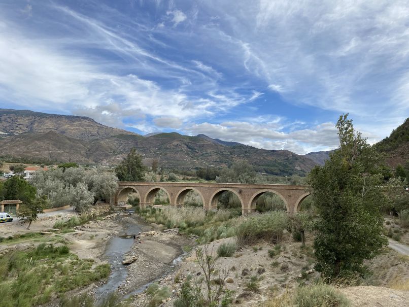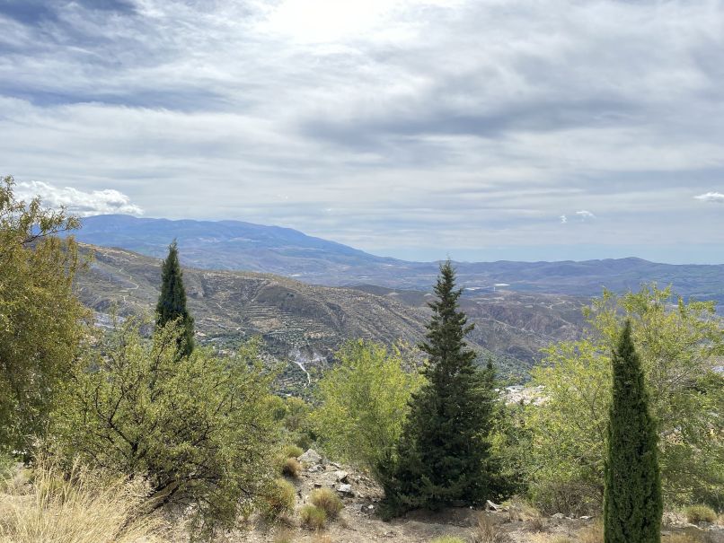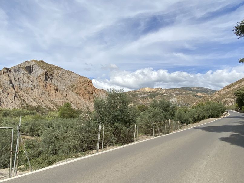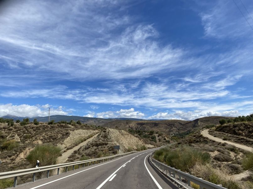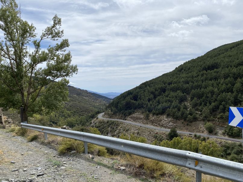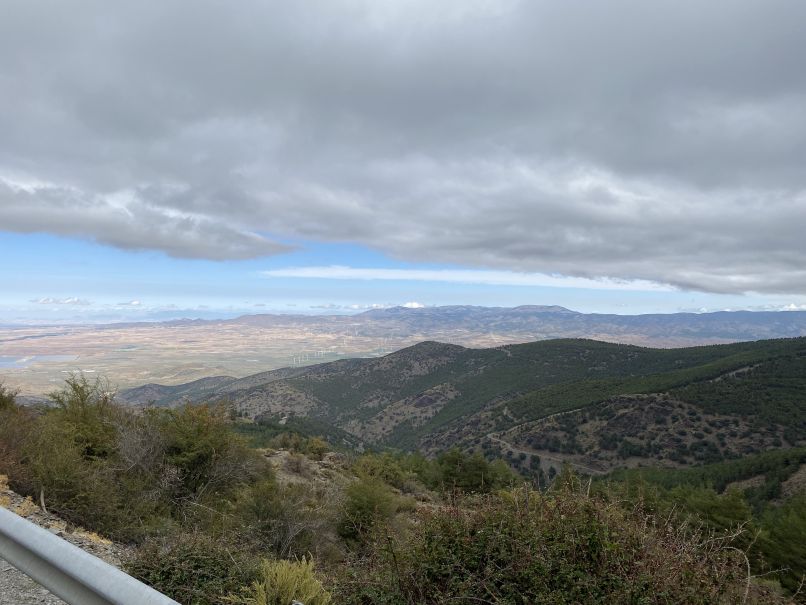 Mit einem letzen sehnsüchtigen Blick übers Mittelmeer und zum tollen Hotelpool haben wir uns in Richtung Berge aufgemacht. Die Sierra Nevada, deren Berge bis faktisch ans Meer reichen, war unser heutiges Ziel. Die größte Erhebung, der Mulhacén, ist 3482 m hoch. Von Salobreña aus ging es wenige Kilometer auf der Landstraße und dann hinauf in die Berge. Die Strecke durch die Sierra Nevada ist gut ausgebaut und hat einen sehr guten Straßenbelag. Eine schön geschwungene Straße, die sich in unzähligen gut ausgebauten Kurven in die Berge hinaufschraubt. Keine steilen Kehren, sondern mal was zum „Schönfahren“. Es gibt über die hohen Felsen keine durchgehende Straßen mehr, sondern nur diejenigen, die sich entlang der Täler hinauf schlängeln und später die Hochebene erreichen. Der Ausblick in die Berge ist unglaublich, aber leider gibt es nicht immer die Möglichkeit, für einen Fotostopp einfach mal so anzuhalten. Der höchste Punkt der Straße liegt bei ca. 2000 m. Dort war es mit 11 Grad deutlich kühler als am Meer und später auch auf der Hochebene.