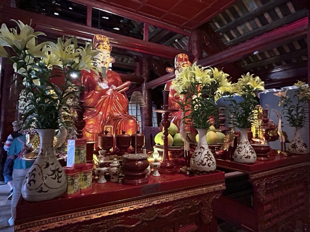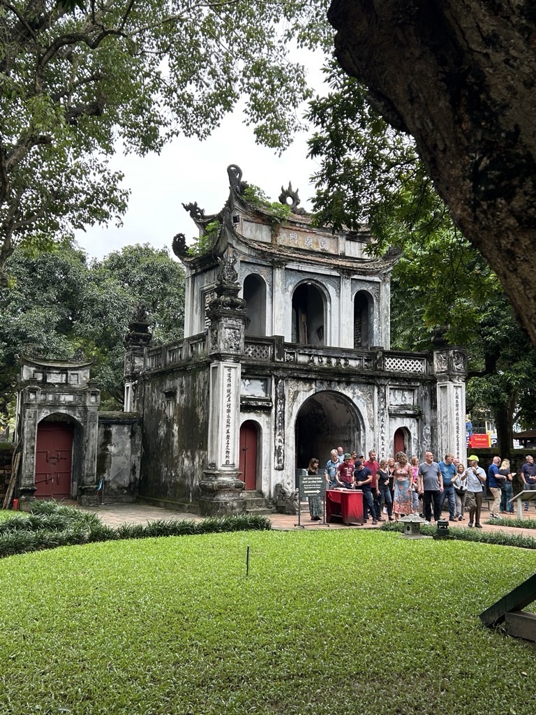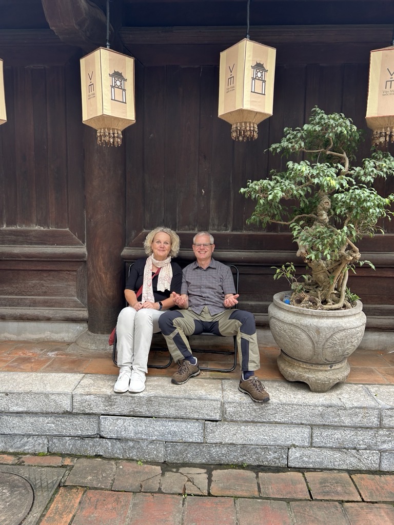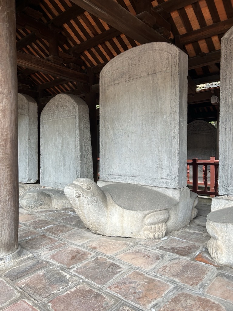 Der letzte Kulturpunkt für heute war der Besuch des Literaturtempels, ebenso mitten in der Stadt gelegen. Hier wirkte Konfuzius in seiner Schule und seine Nachfolger gründeten die erste vietnamesische Universität. Mehrere Innenhöfe dieser Tempelanlage und ein grüner Garten mit Keramiken runden das Bild ab. Noch heute kommen viele Studierende und Schüler hierher, um für eine gute Prüfung zu beten und für eine bestandene Ausbildung zu danken. Die Räucherstäbchendichte insbesondere im letzten Gebäude war schon enorm, die Informationsfülle war für einen Tag mehr als ausreichend und so haben wir uns ein Plätzchen zum ausruhen gesucht…😀