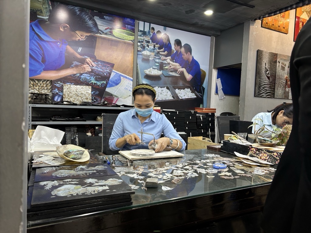 Als Kontrastpunkt nun der Besuch einer Lackbildermanufaktur. Hier wurde uns erläutert, in welchen zahlreichen Arbeitsschritten und mit welchen Materialen diese Bilder gestaltet werden. Niedlich erklärt von einer gut englisch sprechenden jungen Frau mit ein paar kleinen deutschen Einsprengseln - „our Eierschale“ war es schon ganz nett. Ein kleines Bild durfte natürlich auch in den Koffer - ein Mitbringsel muss schon sein.