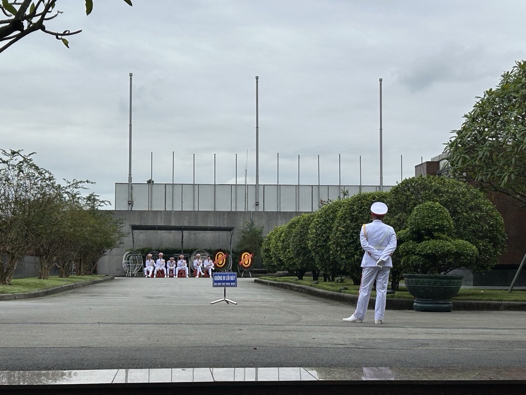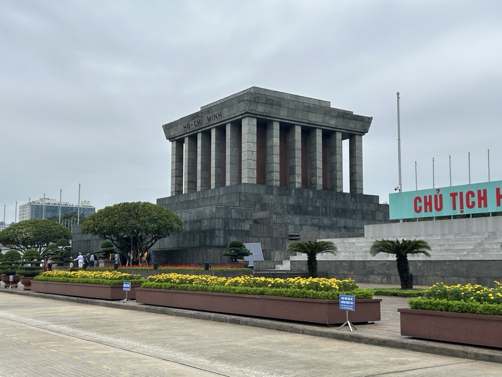 Mitten in der Stadt gelegen gibt es die Kultstätte, in der Ho Chin Min seit 50 Jahren aufgebahrt ist. Die Vietnamesen verehren ihn heute noch und wir schauen uns ihn nun eben auch mal an. Sowjetische Präparatoren haben ihn nach seinem Tod 1969 hergerichtet- die Ähnlichkeit mit Lenin ist frappierend, nur der Bart ist anders geformt.
