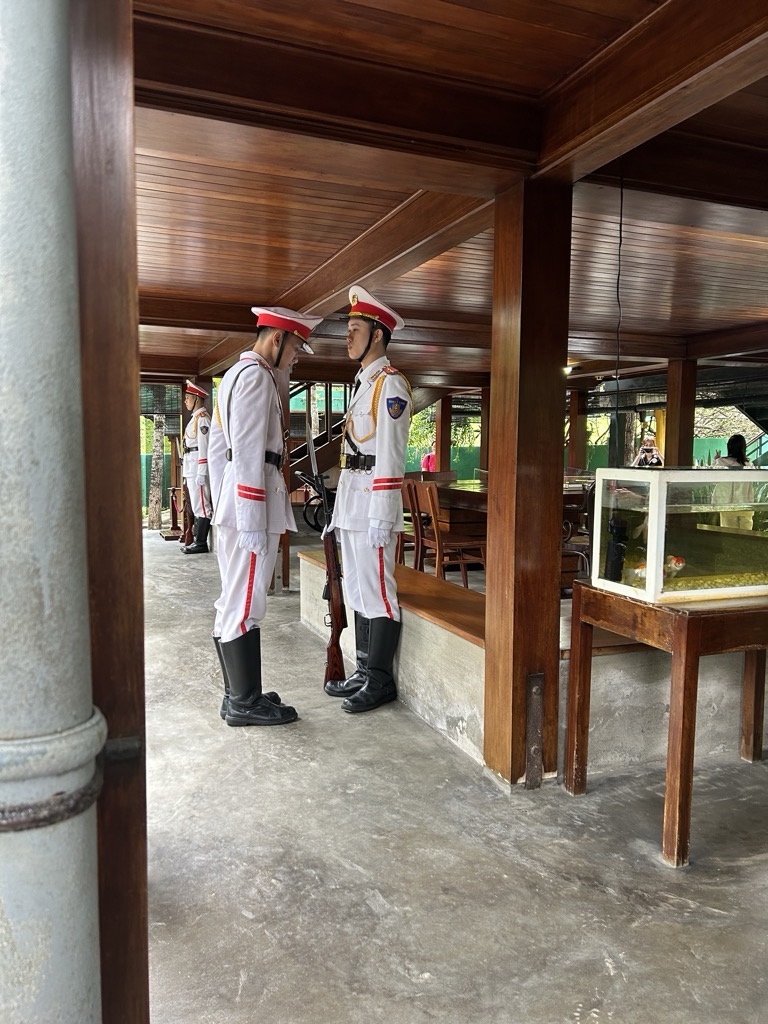 Nach Sicherheitskontrolle und in braver Zweierreihe wird man, vorbei an in weißen Paradeuniformen gekleideten jungen Soldaten, durch das Gebäude geführt.
