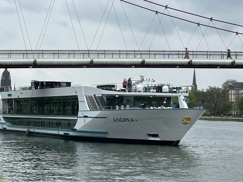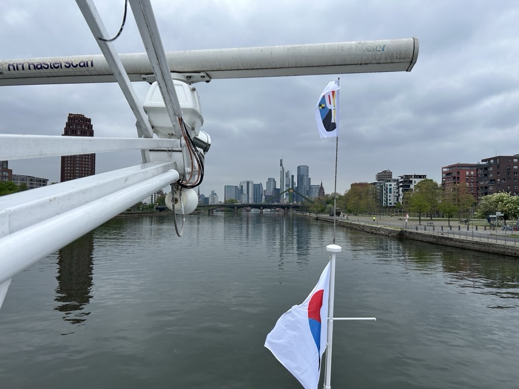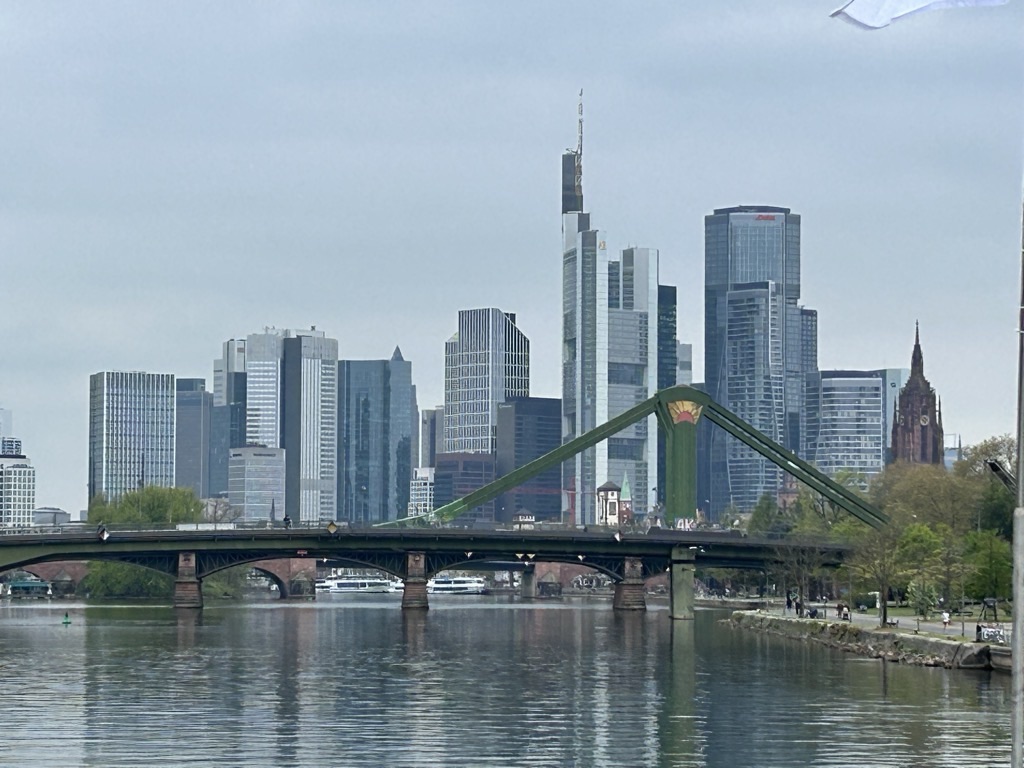 Es ist immer wieder erstaunlich, wie anders eine Stadt vom Wasser aus wirkt, das kann man ruhig mal machen. Und mit 19 € pro Person für 100 Minuten Dampferfahrt ist es auch in Ordnung. Das Panorama der Stadt ist schon sehenswert und erklärt kriegt man auch noch was! Das Wetter in Frankfurt ist bewölkt, aber trocken und bei knapp 15 Grad auch ganz angenehm. Hier sind die Bäume schon richtig grün, ganz anders als zuhause.