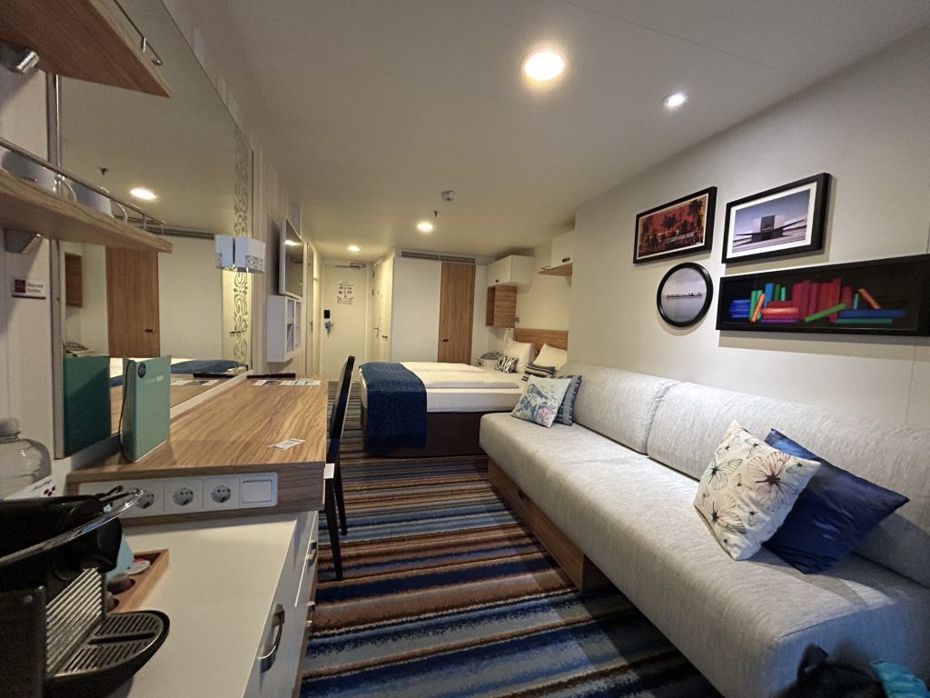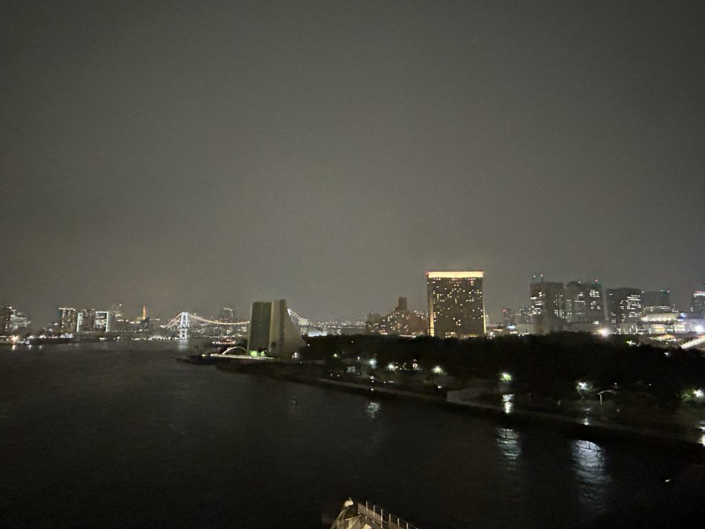 9.05 Uhr Ortszeit ging es weiter und 14.30 Uhr Ortszeit in Tokio – also mit einer weiteren Stunde Zeitverschiebung – sind wir dann an unserem Zielflughafen in Tokio gelandet. Die Einreiseformalitäten waren etwas seltsam, es mussten 2 ähnliche Formulare ausgefüllt werden, die dann von streng schauenden Beamten geprüft wurden. Konnte man wohl auch vorher elektronisch ausfüllen, aber die Schlange an der Einreisekontrolle mit QR-Code war auch nicht kürzer. An jeder Ecke steht ein hilfsbereiter Pinguin und weißt dir den Weg – alles gut organisiert. Von der Gepäckausgabe – das ging wirklich schnell – über die langwierige Einreiseformulare bis zum Bustransfer vergingen schon 90 Minuten nach der Landung. Dann noch der Bustransfer zum Schiff und so waren wir dann gegen 18.00 Uhr auf unserer Kabine. Insgesamt waren wir ab dem Check – Out im Hotel in Frankfurt doch 25 Stunden unterwegs – reicht fürs Erste… wir haben zuerst mal gemütlich zu Abend gegessen, die Koffer ausgepackt und einen Drink an der Poolbar eingenommen – wir haben ja schließlich einen Wohlfühlurlaub gebucht. Jetzt zum späteren Abend regnet es hier in Tokio, aber die Temperaturen liegen so um 20 Grad tagsüber.
