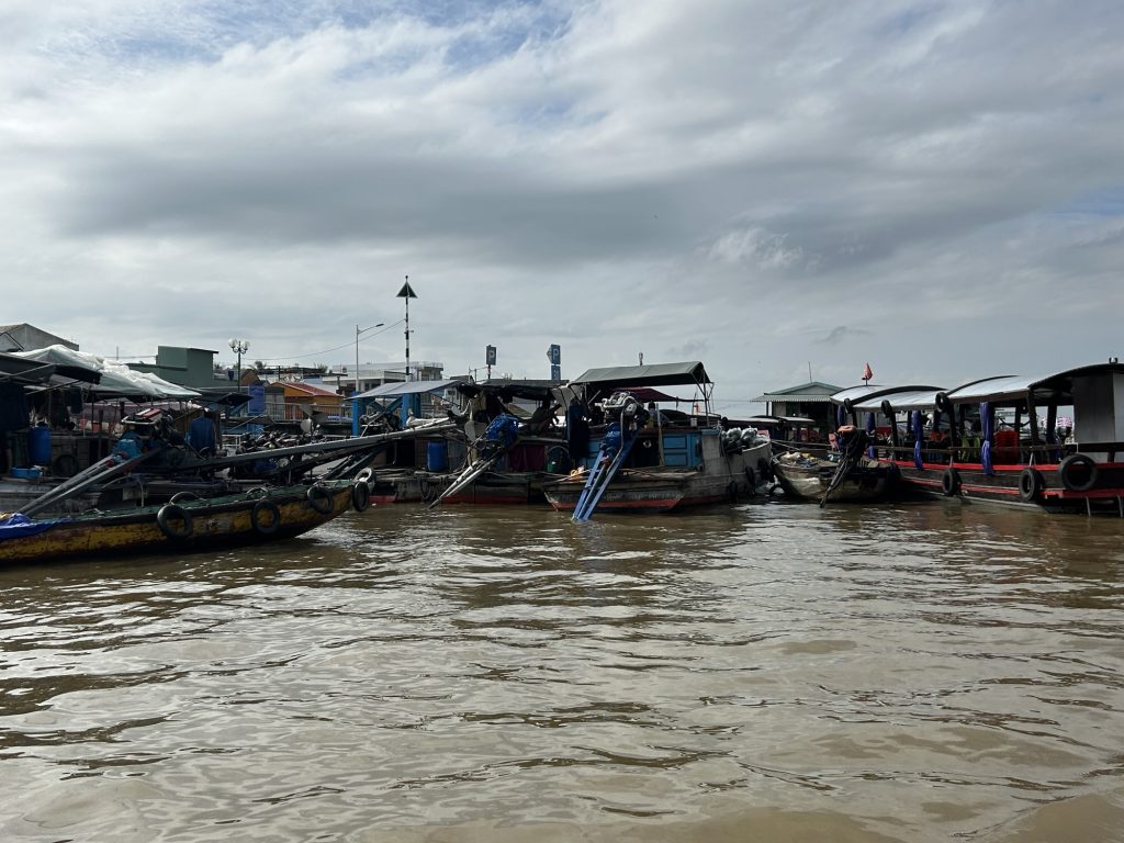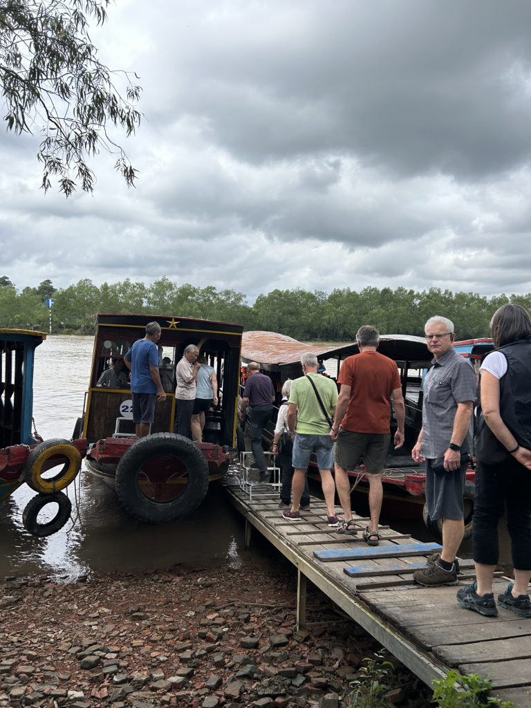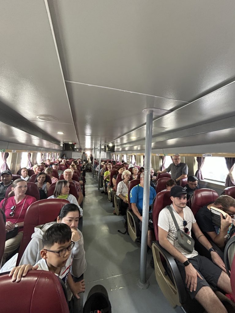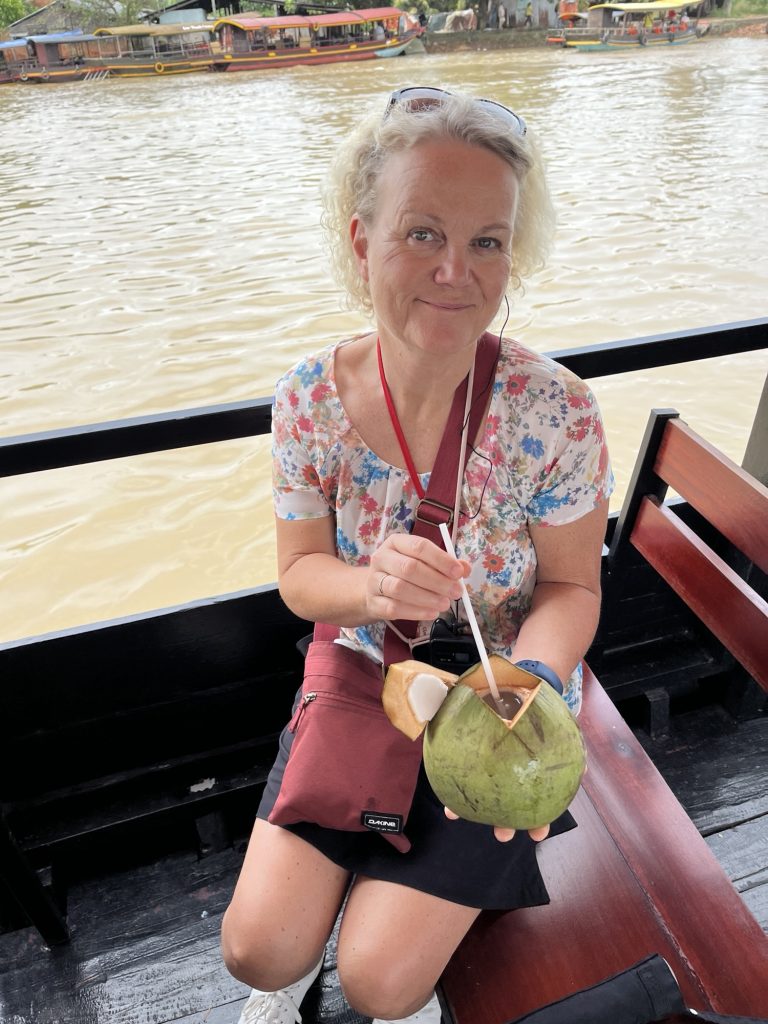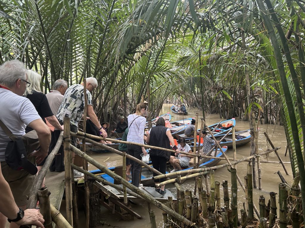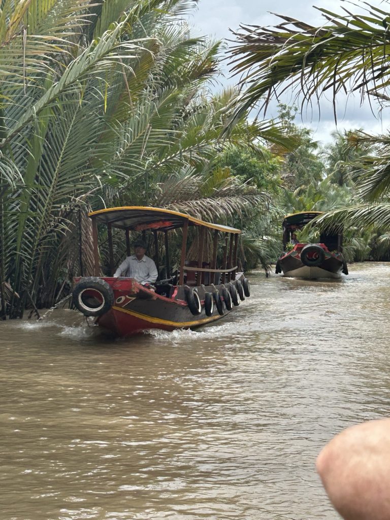 Zurück zum Bus ging es mit dem Motorboot und langsam machte sich das Bratwurstkoma breit… Im Bus dann erst mal ein kollektives Nickerchen , so viel zu sehen gab es draußen jetzt  auch nicht gerade. Nach etwa 90 Minuten hatten wir unser Ziel erreicht, noch ein wenig Stau in der nachmittäglichen Rushhour und dann unsere Ankunft im Hotel. Das Zimmer war groß und geräumig, der Blick auf dem Mekong sehr schön. Nach unserem Bummel durch die Stadt und ein Abendessen in einem sehr netten Lokal haben wir - wieder im Hotel ankommen - feststellen müssen, dass die Klimaanlage im Hotelzimmer nicht funktioniert. Innerhalb von weniger als einer Minute war ein Techniker da, der sich mit seinem Kollegen nach Kräften bemühte. Aber die Klimaanlage war nicht wieder zu beleben, so dass wir noch um 22.00 Uhr in ein neues Zimmer umgezogen sind. Hat zwar alles ein wenig Wirtschaft gemacht, aber der Service und das Bemühen haben uns tatsächlich beeindruckt - das ist in unserer Augen nicht selbstverständlich! Das neue Zimmer ist zwar „nur“ im 5.Stock, aber wir werden es verkraften…😉