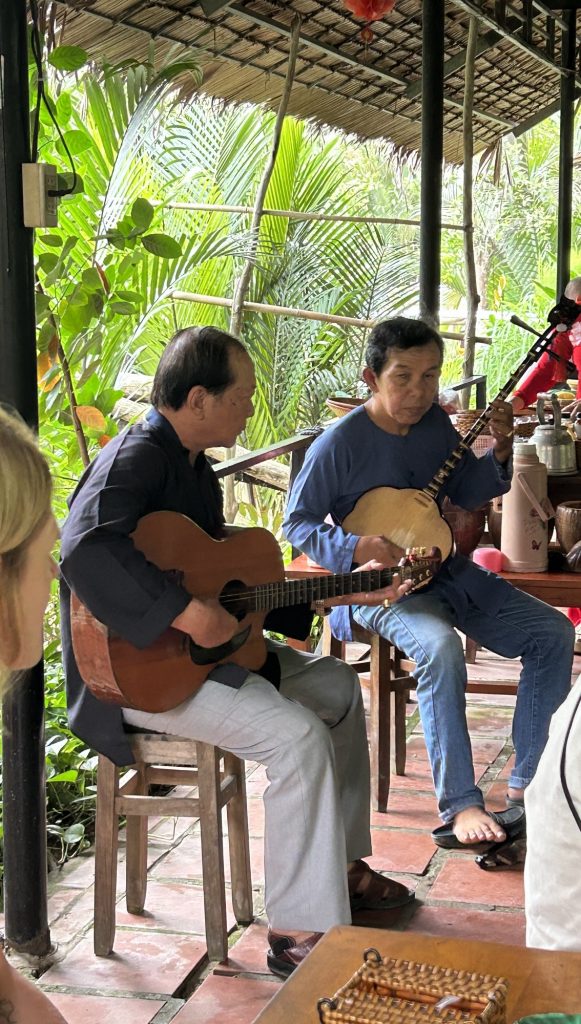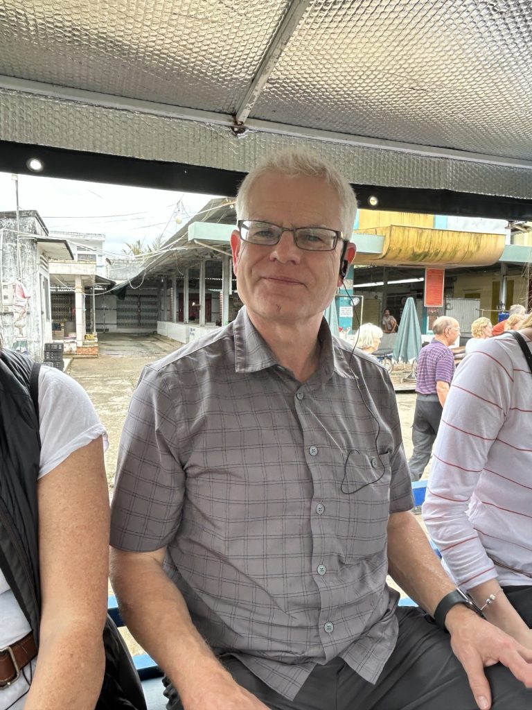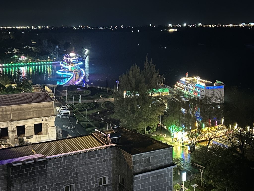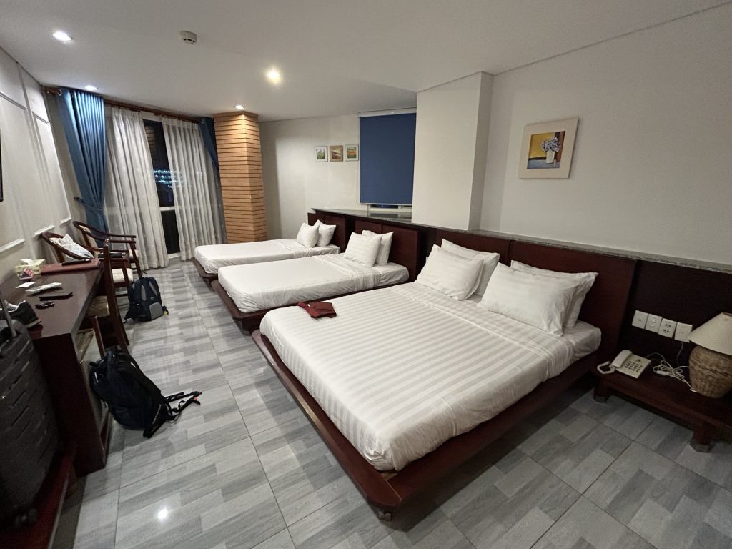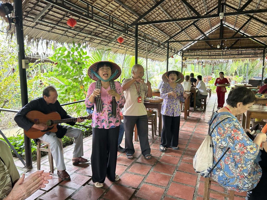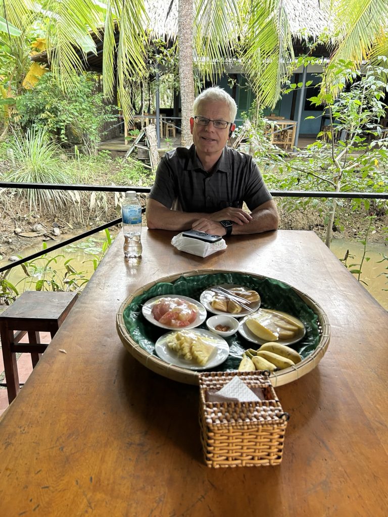 Zurück zum Bus ging es mit dem Motorboot und langsam machte sich das Bratwurstkoma breit… Im Bus dann erst mal ein kollektives Nickerchen , so viel zu sehen gab es draußen jetzt  auch nicht gerade. Nach etwa 90 Minuten hatten wir unser Ziel erreicht, noch ein wenig Stau in der nachmittäglichen Rushhour und dann unsere Ankunft im Hotel. Das Zimmer war groß und geräumig, der Blick auf dem Mekong sehr schön. Nach unserem Bummel durch die Stadt und ein Abendessen in einem sehr netten Lokal haben wir - wieder im Hotel ankommen - feststellen müssen, dass die Klimaanlage im Hotelzimmer nicht funktioniert. Innerhalb von weniger als einer Minute war ein Techniker da, der sich mit seinem Kollegen nach Kräften bemühte. Aber die Klimaanlage war nicht wieder zu beleben, so dass wir noch um 22.00 Uhr in ein neues Zimmer umgezogen sind. Hat zwar alles ein wenig Wirtschaft gemacht, aber der Service und das Bemühen haben uns tatsächlich beeindruckt - das ist in unserer Augen nicht selbstverständlich! Das neue Zimmer ist zwar „nur“ im 5.Stock, aber wir werden es verkraften…😉