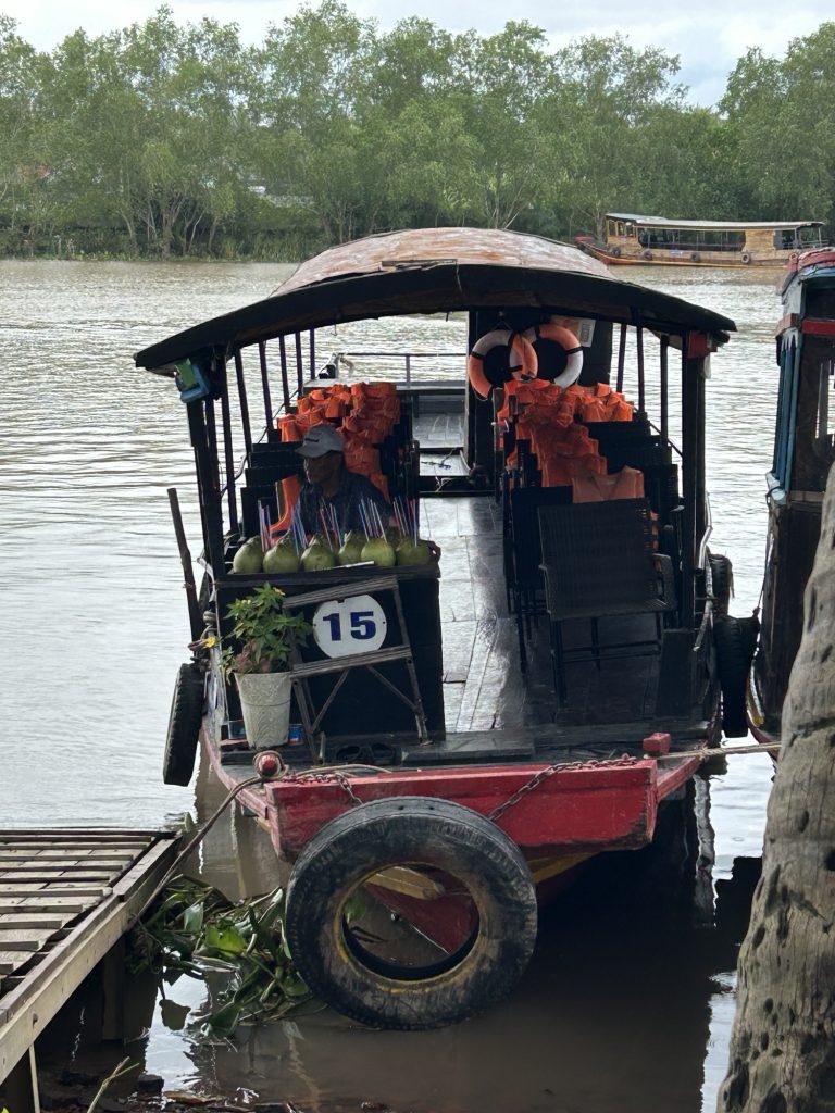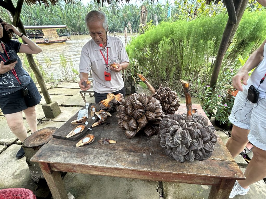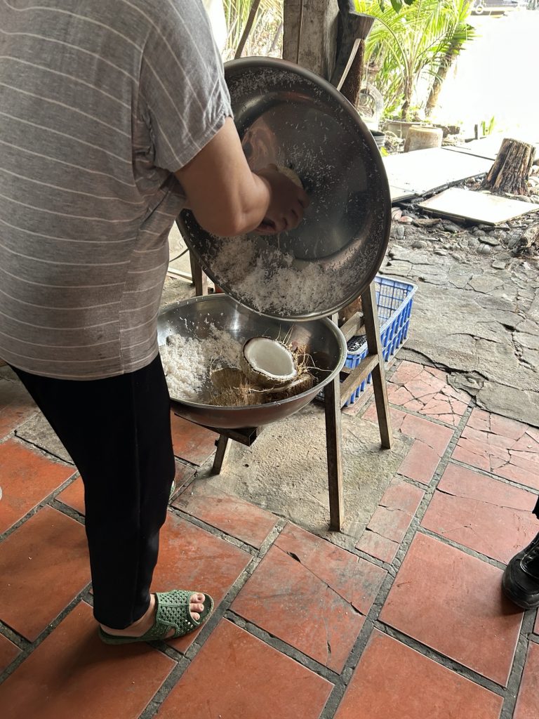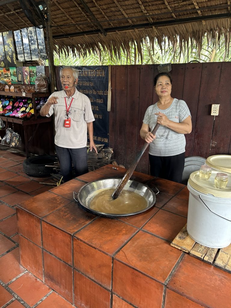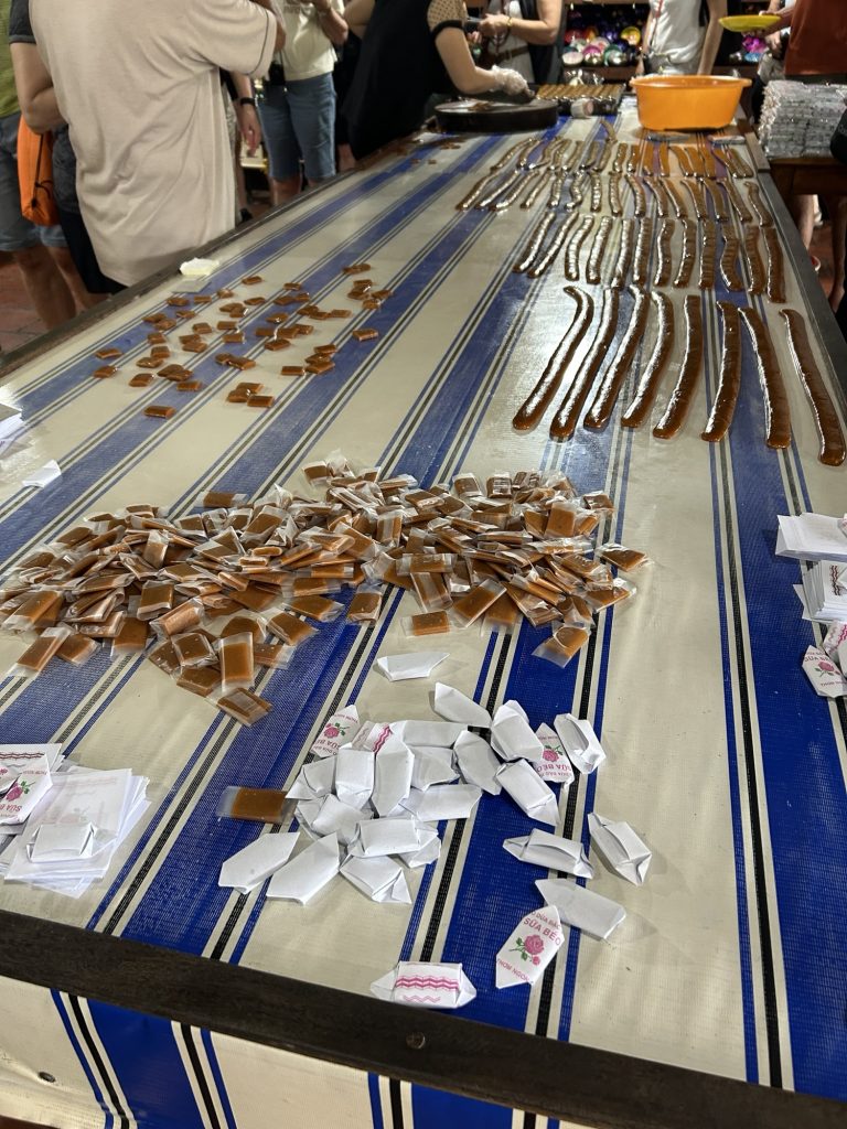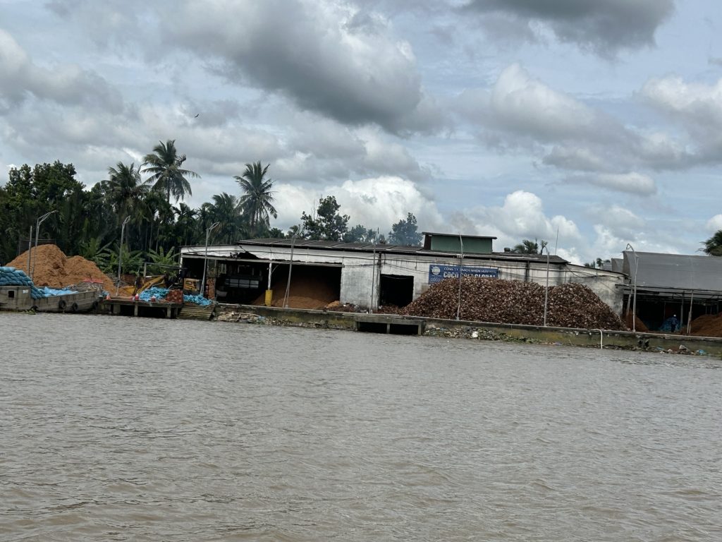 An den von uns besuchten Flussarmen herrschte der Dschungel aus Kokosnussbäumen und Wasserkokosnussstauden (tolles Wort…😇)vor. Und so gab es am Flussufer Firmen für die Herstellung von Kokosnussfasern für Blumenerde, Kokosnussholzkohle und natürlich auch für weitere Kokosnussprodukte. Wir besuchten einen Betrieb zur Herstellung von Kokosnussbonbons und -Kosmetik, selbstverständlich konnte man die Produkte auch kaufen. Ein paar Tüten Bonbons mussten mit, die sind echt lecker…😋