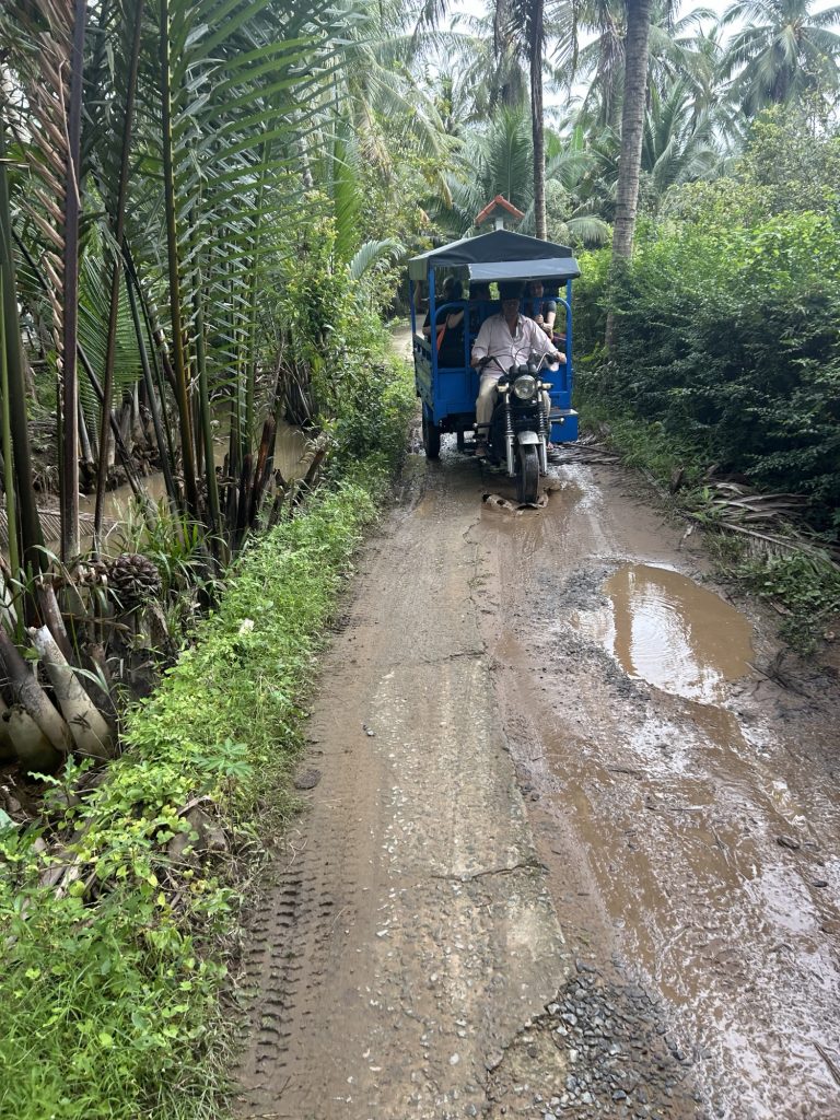Dann ging es weiter zur Fähre nach Rach Giá, ca. 3 Stunden Busfahrt durch das Mekong-Delta. Alles grün soweit das Auge reicht, Siedlungen, kleine Städte, Händler am Straßenrand. Was uns zunehmend auffällt - der Süden Vietnams hat ein Müllproblem. Die Gegend ist teilweise sehr arm, es gibt in den Ortschaften ganze Straßenzüge aus Wellblechhütten.