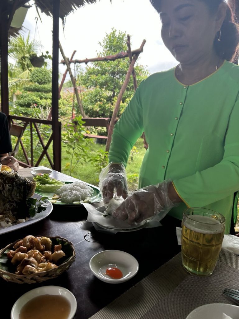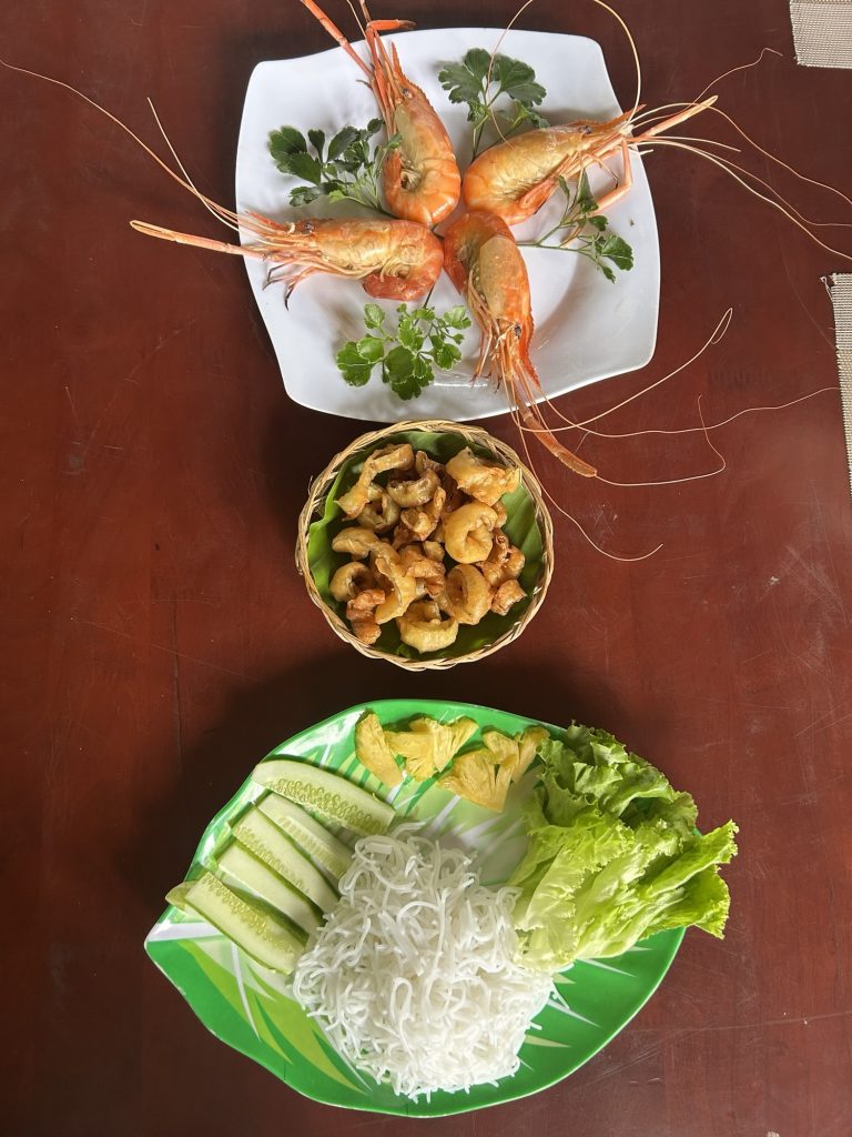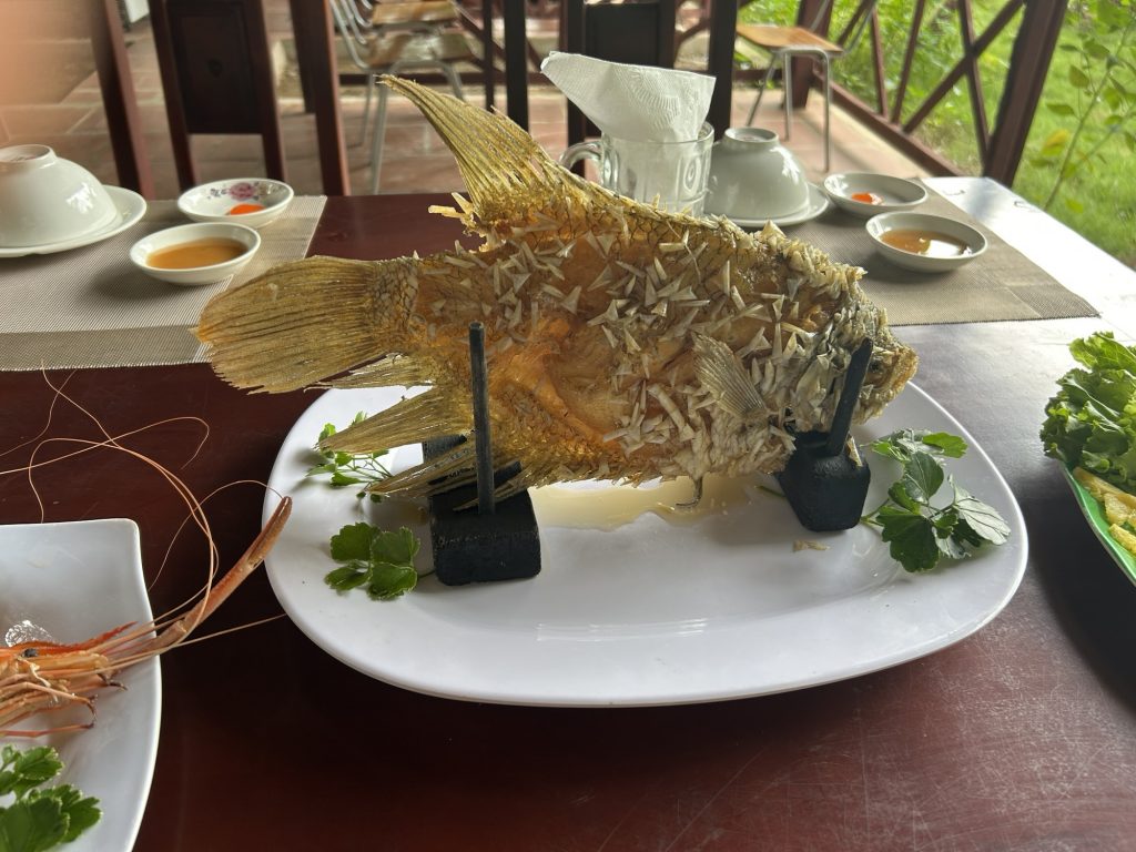 Unser Mittagsstopp erreichten wir mit dem Ruderboot und es wurde uns wieder reichlich aufgetischt. Kürbiscremesuppe, Garnelen, ein Elefantenfisch, Hühnchen, Reis, Gemüse und Obst - alles sehr lecker und reichlich.