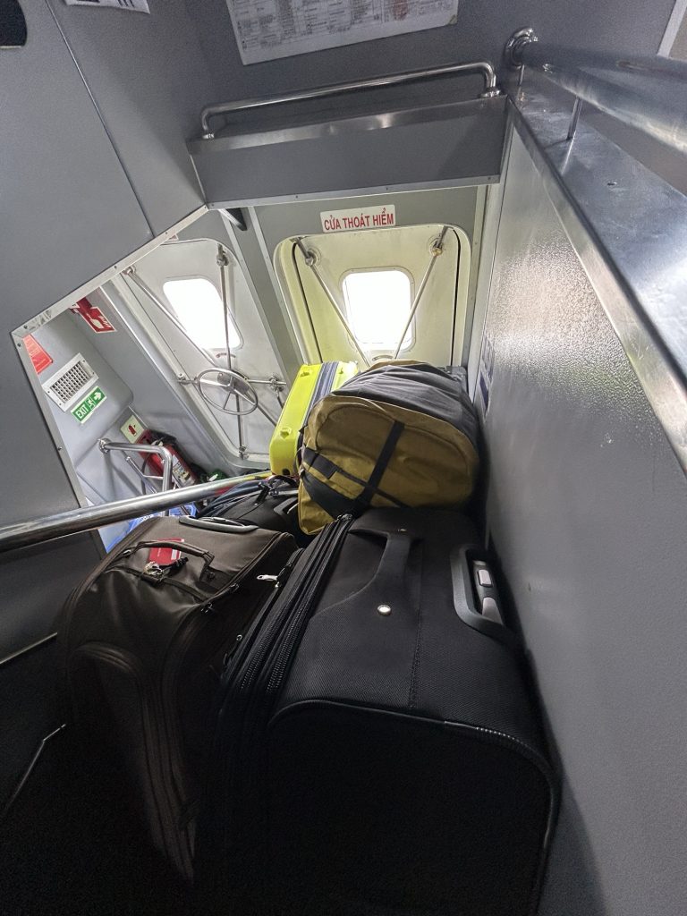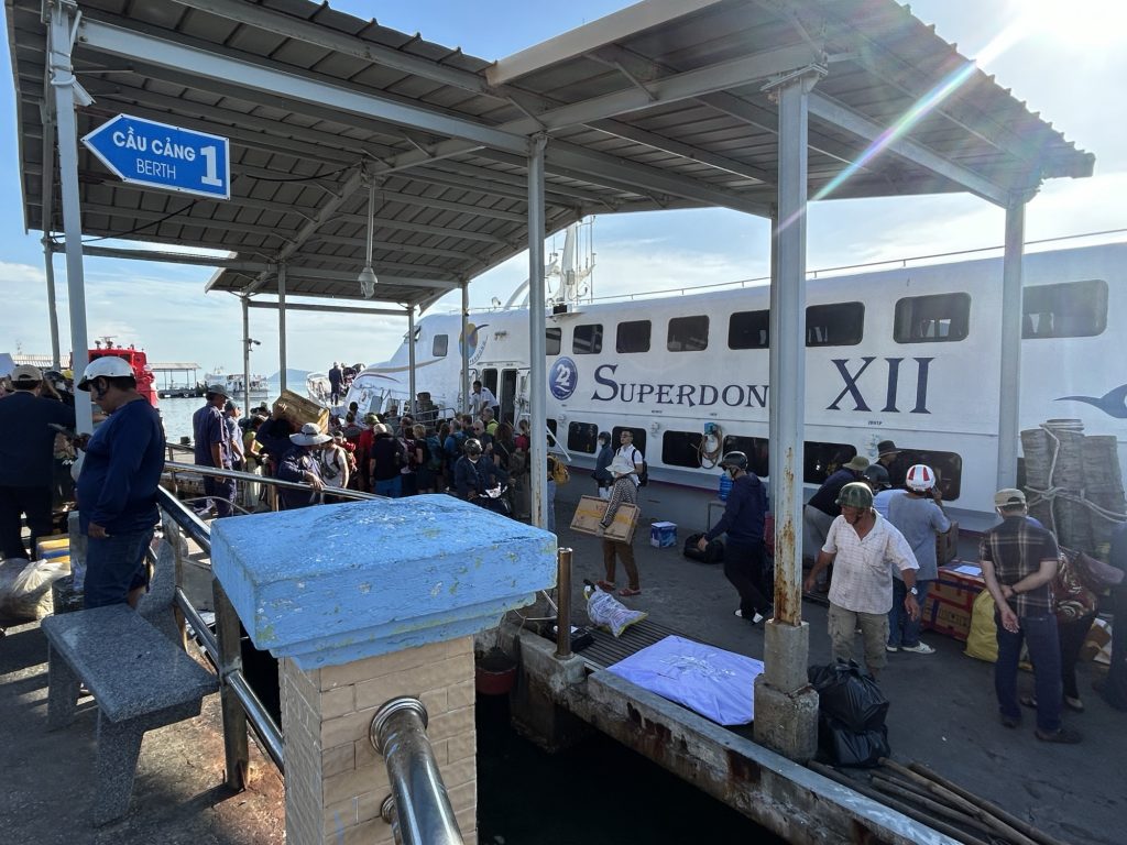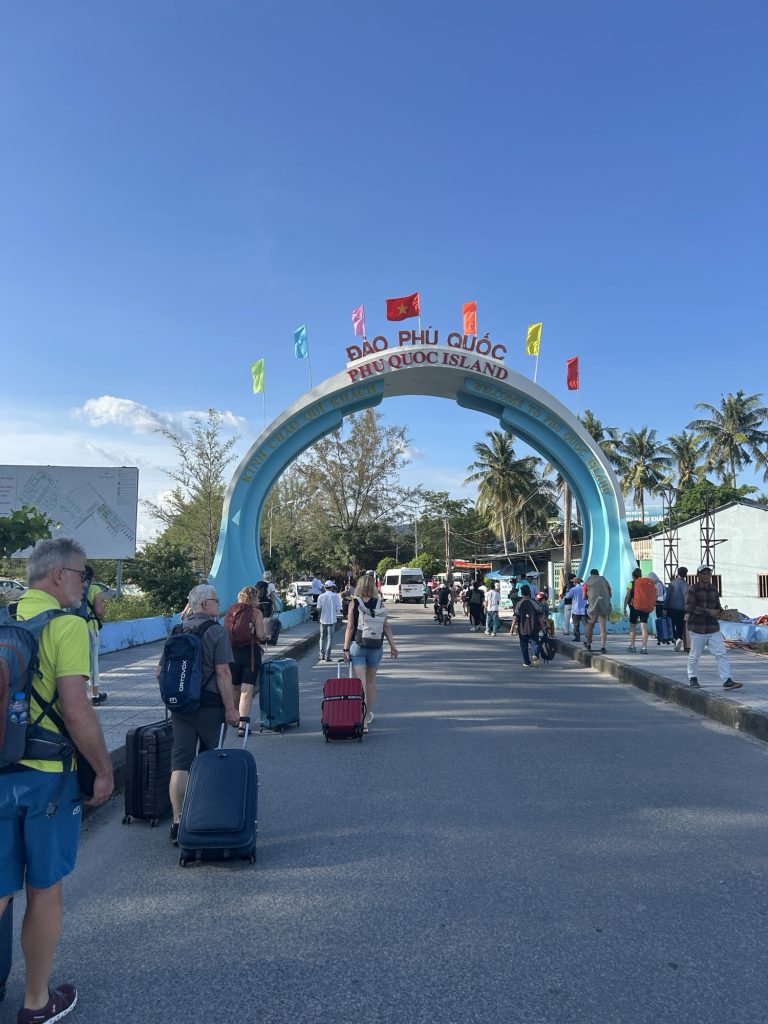 Mittlerweile gibt es viele weitspannnende, teilweise mehrere Kilometer lange Brücken über die Arme des Mekong, gebaut von Firmen aus aller Welt. Etwas einschläfernd ist so eine lange Fahrt allerdings doch. Im Fährhafen angekommen ging es auf eine Schnellfähre, die uns in 2,5 Stunden auf die Insel übersetzt. Die Fähre war voll, der Gepäcktransport merkwürdig, das Bordprogramm seltsam - na wenigstens hatte ich meinen Tolino und ein spannendes Buch dabei.