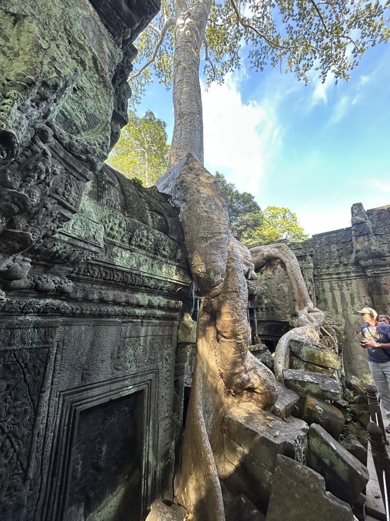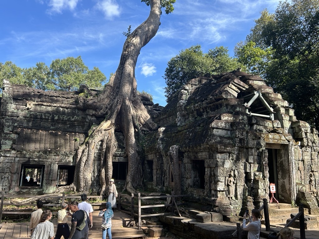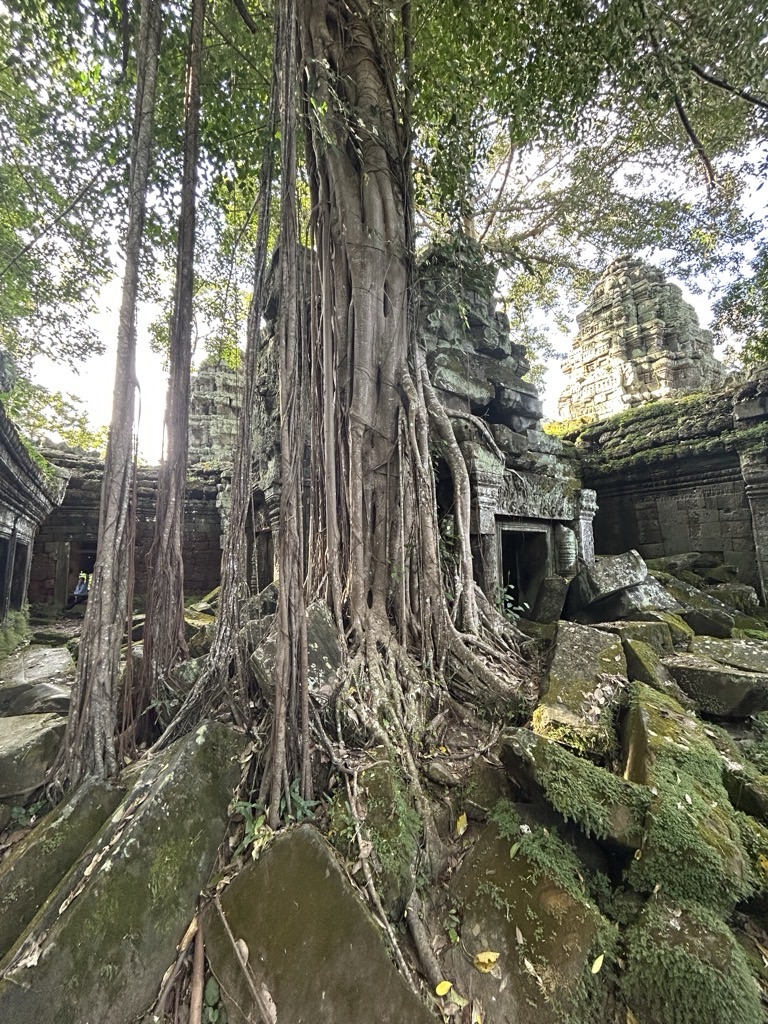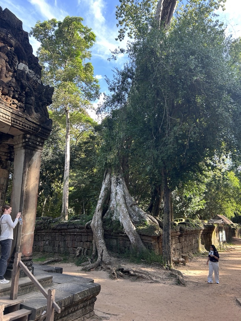 Die dritte Tempelanlage war der sogenannte Dschungeltempel, eine von Würgefeigen nahezu vollständig überwucherte Anlage, die der Tomb Raider-Verfilmung mit Angelina Jolie als Kulisse in den frühen 2000er Jahren diente. Diese Anlage machte auf mich den meisten Eindruck, da sie so geheimnisvoll und zugleich mystisch anmutet und im aktuellen Zustand erhalten bleiben soll. Sie wird also nicht wieder aufgebaut, sondern eigentlich nur gesichert. Durch den starken Bewuchs siedeln auch viele Tiere hier, die mit der entsprechenden Geräuschkulisse für das absolute Dschungelfeeling sorgen.