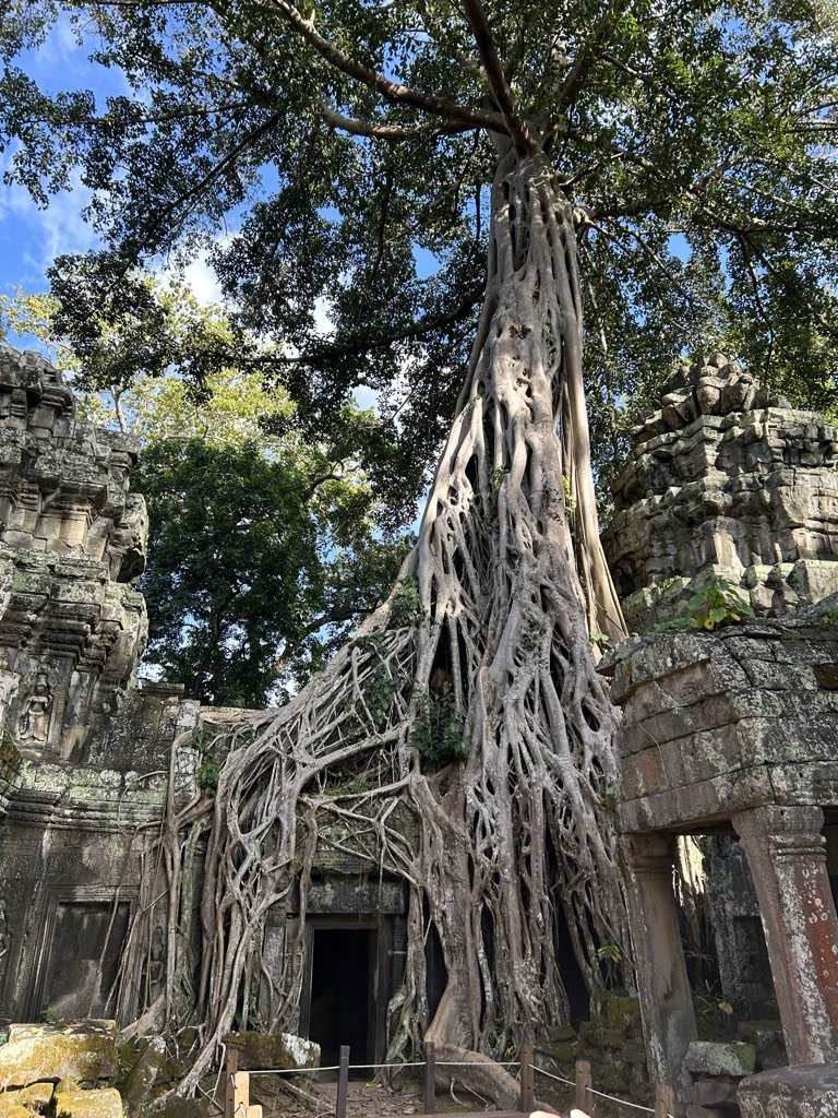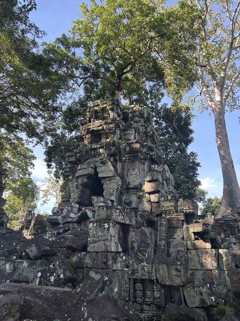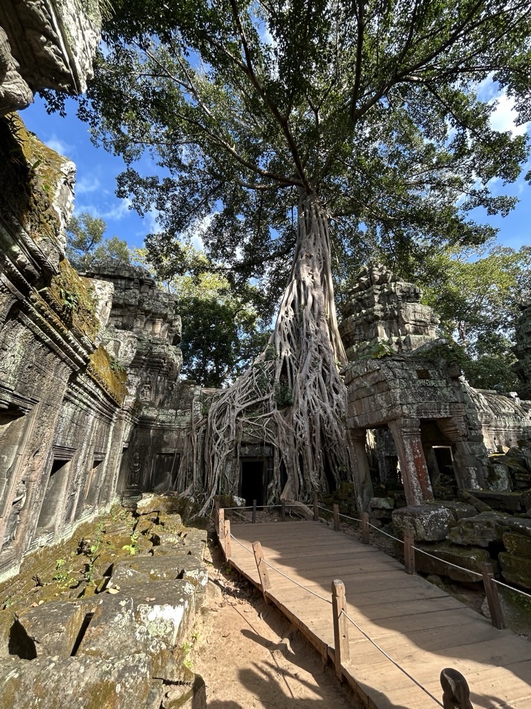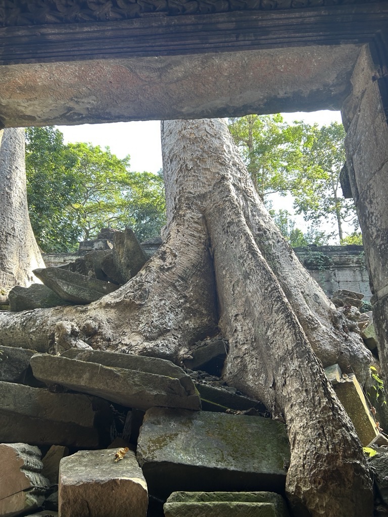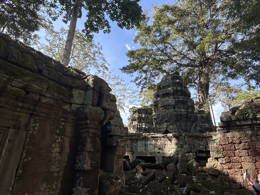 Die dritte Tempelanlage war der sogenannte Dschungeltempel, eine von Würgefeigen nahezu vollständig überwucherte Anlage, die der Tomb Raider-Verfilmung mit Angelina Jolie als Kulisse in den frühen 2000er Jahren diente. Diese Anlage machte auf mich den meisten Eindruck, da sie so geheimnisvoll und zugleich mystisch anmutet und im aktuellen Zustand erhalten bleiben soll. Sie wird also nicht wieder aufgebaut, sondern eigentlich nur gesichert. Durch den starken Bewuchs siedeln auch viele Tiere hier, die mit der entsprechenden Geräuschkulisse für das absolute Dschungelfeeling sorgen.