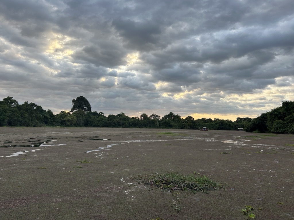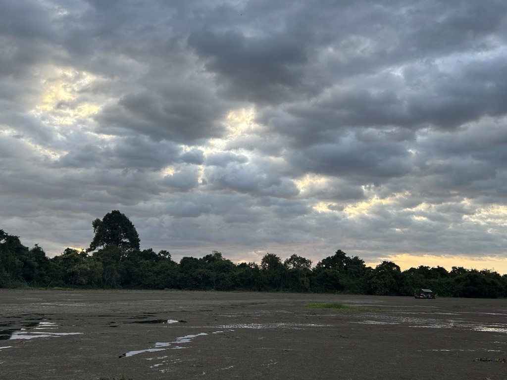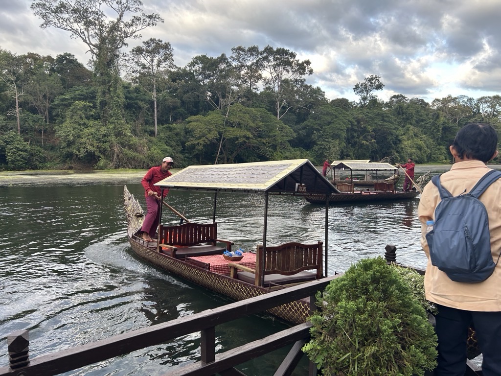 Der letzte Kulturpunkt für heute war eine Bootsfahrt auf dem See vor dem Angkor Tom, um den Sonnenuntergang zu sehen. Leider verhüllte sich der Himmel kurz vorher, sodass kein Sonnenuntergang zu sehen war. Die Geräuschkulisse aus dem Urwald und die Abendstimmung waren trotzdem toll und ein paar nette Fotos sind auch noch entstanden, zumal Thomas jetzt mit dabei sein konnte und sein Gesundheitszustand doch wieder besser ist. Die Reiseleitung hatte ein Tuk-Tuk organisiert, welches ihn zum Startpunkt schaffte.